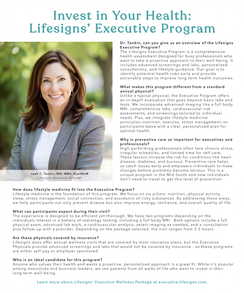 Memphis Health+Fitness Magazine featured Dr. Leah Tonkin and our Executive Wellness Program, which is a deep-dive health assessment with advanced imaging, extensive labs, and a personalized plan built around lifestyle medicine.